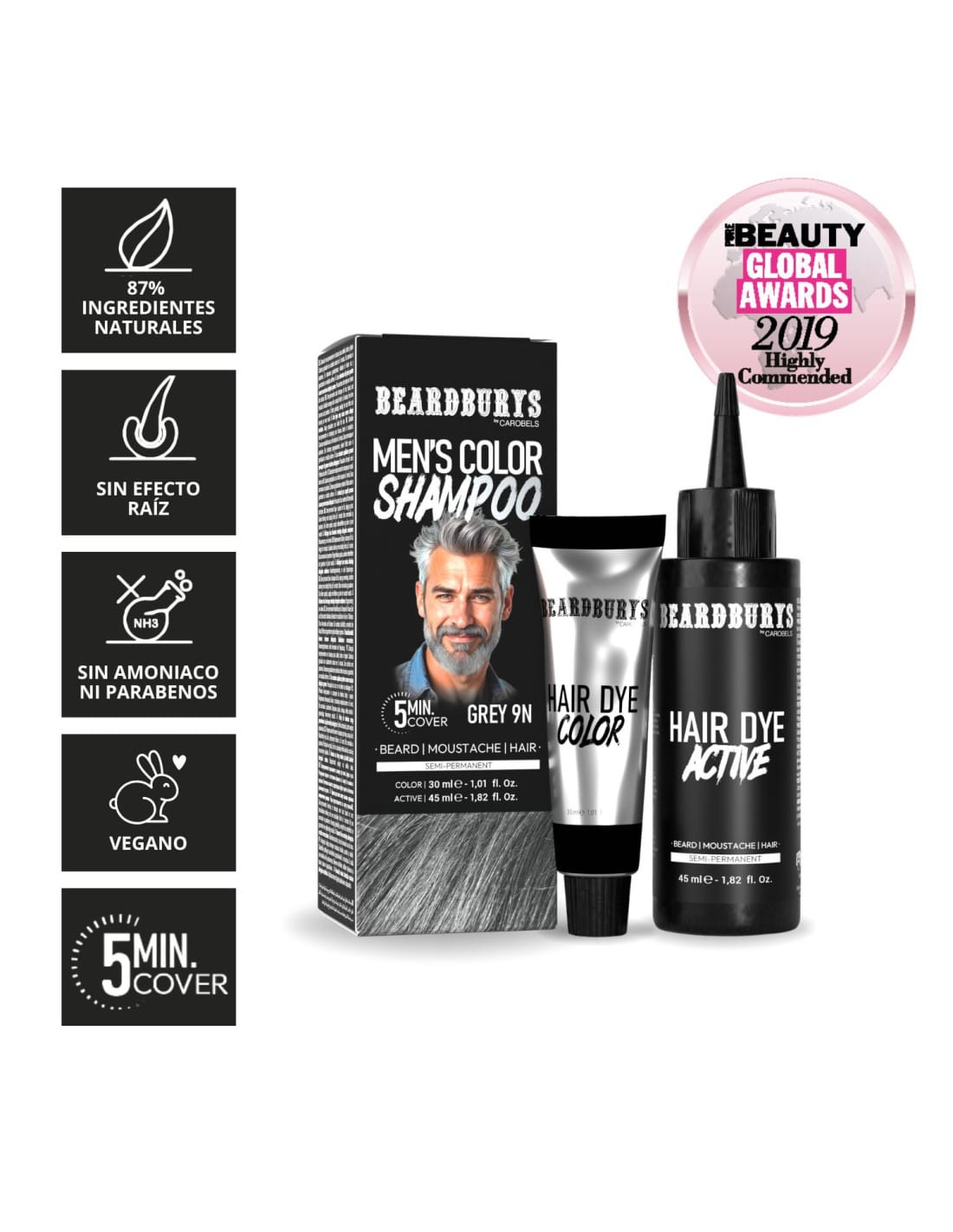 Tinte para Barba y Bigote | Champú de Color 9G Gris de Beardburys ha sido diseñado para aportar un tono gris homogéneo y actual a barbas y cabellos que presentan canas o diferentes tonalidades. Su formato champú permite una aplicación rápida, limpia y sin complicaciones.